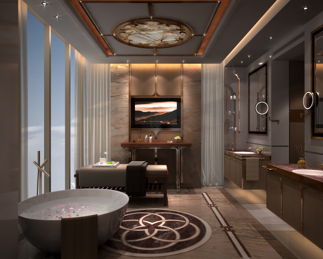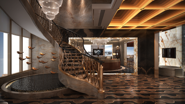 主卫和公卫尤其注重光线,古典的纹饰与咖色使灯光柔和,加入科技木的使用给人惬意与轻松感.两处楼梯间在谢剑华设计下,采用简洁流畅的线条,镀铜的材质在光线的配合下突出了优雅而不奢侈的风格.下方的水池补充了单调的环境,体现了高雅的生活情趣.