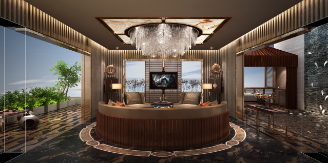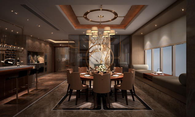 株洲神农城奥园空中墅不同于传统中式别墅,以咖色及同色为主调,采用天然大理石,科技木,拉丝不锈钢镀铜,墙纸等材质,运用Artdeco元素进行设计建造.在整体布局的古典风中蕴含着现代科技的摩登装饰.