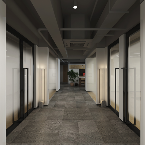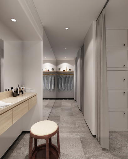 不同于广阔的授课区,更衣室与洗手间遵循实用性原则,精简的空间搭配色彩单纯的仿岩石瓷砖让其更加注重功能性与使用性.让学员更加注意瑜伽课上的秩序.