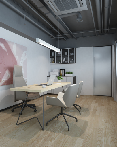 谢剑华设计的小巧办公室区麻雀虽小五脏俱全,白蜡木质的桌椅门窗线条明晰,使光线更加柔和,适合高效的办公与洽谈.