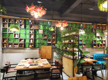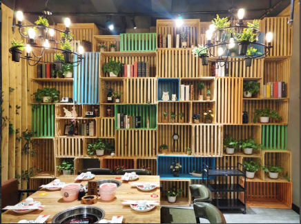 餐厅内部有建筑钢筋及木搭建起来的格栅结构分隔内部空间,同时在格栅中融入盆栽,书柜及灯饰,灯多种功能,营造了一处温室花园的气氛。在这里吃上一顿热气腾腾的火锅,不仅舒缓了都市的紧张节奏,同时也获得了回归田园、回归自然的生活体验。