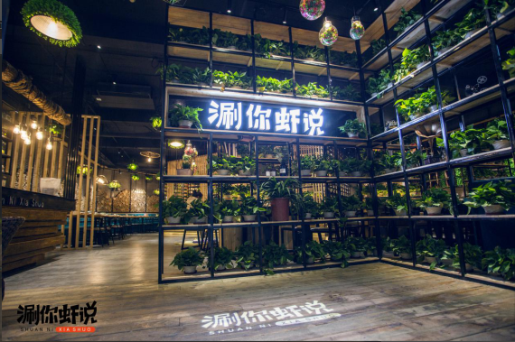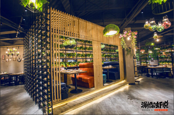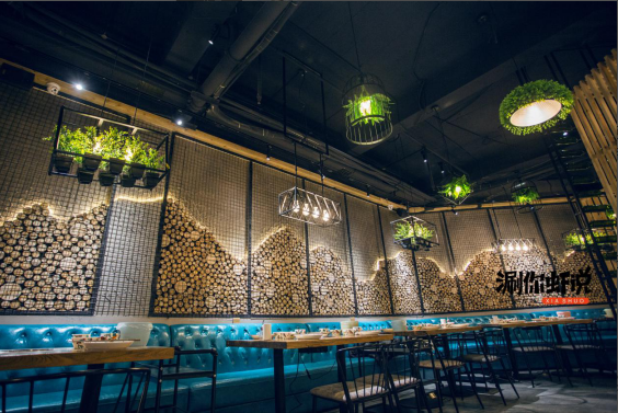 翟金旭设计师将原生态的木材,黑色的钢筋酒架,湖蓝色皮质的沙发,摆放满满的绿植盆摘,随处吊挂的盆景吊顶,营造出一种回归自然的感官体验,使涮你虾说餐厅成为这座繁华城市中的一片清幽的度假绿洲。