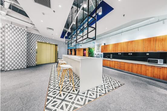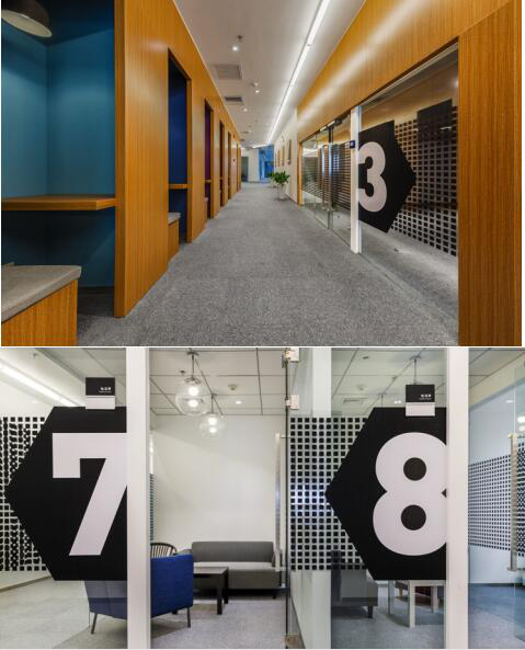 清石设计把品牌logo作为创意灵感,把金属的刚性和木材的柔性组合起来,刚柔并济之间产生想要的温度和酷炫。以接待、共享咖啡吧多元化为一体的空间为例,就是在把建筑结构建造,空间颜色的搭配还有线条结合起来。不同的地面材质,就代表了不同的空间功能,材质上选用了硬软相结合的六棱形白砖,花色砖还有地毯等。空间色彩上也呈现出多样化,色彩主基调有明黄与湖蓝两色,两种颜色中,用黄色带动了欢畅轻快的暖色调,用蓝色调节了淡定睿智的冷色调,两种颜色形成了空间色彩上的配合,又互相抵消色彩上的锐度,很好的中和了空间的单调色彩,值得一提的是,室内导视牌不仅仅色彩丰富性,而且造型多样化,再加上优客标志使得空间更加有工作氛围。