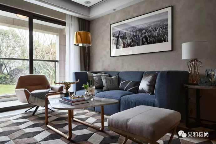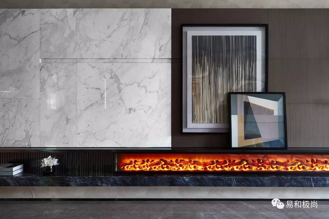 在高级灰的主调下,任凭灰蓝、灰咖、米灰自由穿梭。金属与大理石外表下的冷酷质感、纺织布艺的温柔亲肤与皮革制品带有的手工温度,交缠错综,刚柔相济。定制壁炉与优雅的Minotti沙发,隐约显露出居所主人优越的品味。