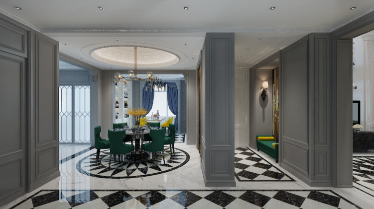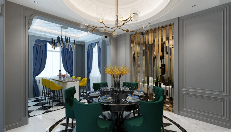餐厅分为主餐厅和副餐厅,采用绿色和黄色系搭配给人一种耳目一新的感觉,并且明快的颜色能让人感觉到和煦的温暖,同时让人食欲大增。若全部采用亮色则让人感到烦躁和压抑,此种搭配最为合适。具有骨感的黄色吊灯和深沉的蓝色吊灯,再搭配上镂空的金属材质墙面,让空间变得通透开阔。餐厅的风格遵循整体的家居风格,整体协调能够更突出家的味道。