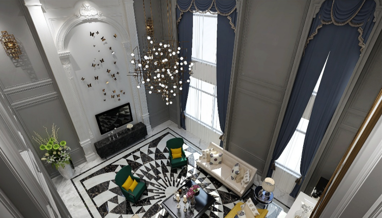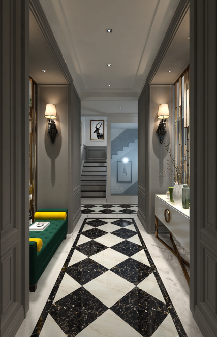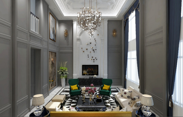 本案赵友文设计设计打破了现代美式惯用的白色为主的色彩,而是采用低调、高雅的灰色调为主,更加年轻化,空间以金属、皮革的中性色调为主,用色彩的纯度传递细腻的质感,造型简洁,线条流畅的家具组合搭配,通过对线条与色块的巧妙应用,营造出轻松的空间氛围,传递“轻奢华、新时尚”的生活理念。