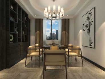 餐厅的设计风格简洁多变,简约木质材料餐桌搭配暖黄色布艺餐椅,颜色非常温和舒适。黑色木质摆设柜沉稳大气,实用又美观,里面陈列着许多中式风格的装饰品。