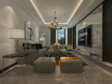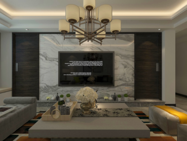 电视背景墙采用木质材料与花纹大理石材质相结合设计,简单又大气。不需要浮夸的装饰,归于清新淡雅的质感就好。电视下方摆设着盆栽植物与摆件,美观自然。顶灯设计不繁琐复杂,更凸显了整个空间简单实用的风格。窗帘也采用纯色系布艺,颜色不会过于张扬,反而更加低调沉稳,减缓现代化生活节奏,让主人返璞归真,享受舒适的生活。