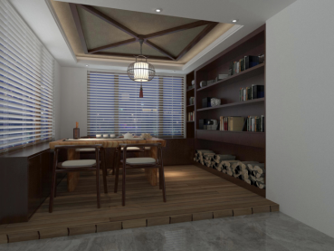 茶室的设计偏新中式简约风格,木质地板做高设计,让空间凸显层次感,木质纹理茶桌椅舒适休闲,墙壁一面做成书柜设计,非常方便实用。底下放置许多木柴,仿佛让人回归了自然的气息,那么宁静致远,脱离工作的繁忙与仕途的不快,回到家中,修心养性,泡上一壶茶,听着舒缓的音乐,静静的体会这份安逸,这份宁静。