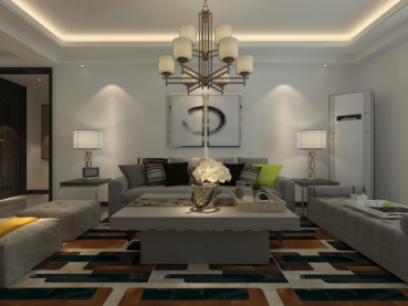 客厅的整体色调以白色为主,大面积白色背景墙与灰色布艺沙发相搭配,质感十足。墙上挂着一幅简约风格图案的画,颜色素雅淡丽,与整体设计很和谐。两边的白色台灯设计也与整个客厅色调非常搭配。地毯的颜色比较鲜艳,刚好有一个视觉冲击力,在一片素净的空间里增添一抹亮丽。