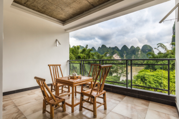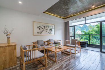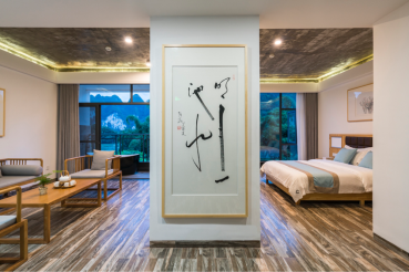 套房的设计非常舒适休闲,一面挂着字画的大墙作为两个空间的隔断,隔出卧室与客厅。做旧风木地板跟天花板显得十分温馨又闲趣,仿佛置身在山间小屋里,随性洒脱。木质沙发椅简单随意,无需过多的装饰,简简单单就是真,阳台上风景乍现,可以享受大自然赐予的美景。