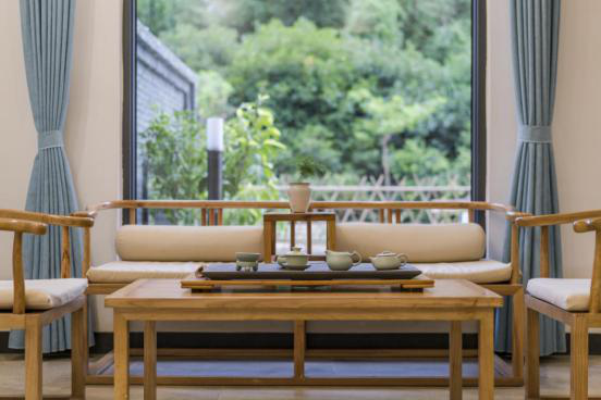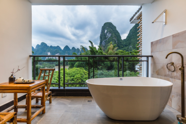 阳台的设计很是匠心独具,洁白的浴缸放置在阳台上,旁边便是茶桌,泡上一壶好茶,几碟点心,在日光下沐浴,竟有一种莫名的舒心。一边泡澡一边遥望窗外风景,连绵起伏的群山、郁郁葱葱的树木。