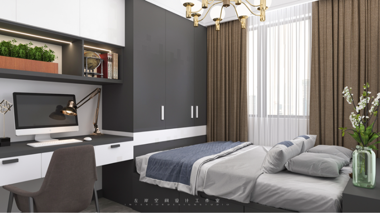 次卧设计简单实用,采用榻榻米床设计,让空间得以充分利用,柜子与电脑桌相连,黑白色搭配非常经典耐看。