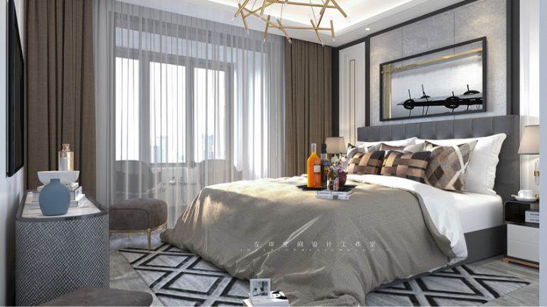 灰色布艺床与菱格地毯搭配非常舒适时尚,顶灯设计个性独特,采用金属材质,与背景画的金属感相辅相成。白色窗帘清新淡雅,阳台上放置桌椅,在空闲的时候可以稍作休息,看看窗外美景。