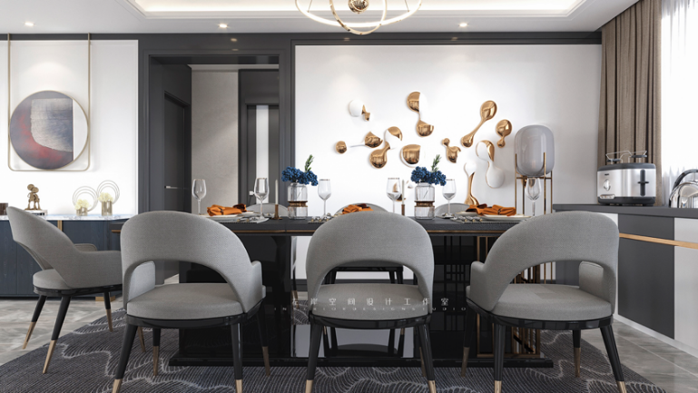开放式厨房设计,较传统厨房相比,更能充分利用空间,让空间更加宽敞、明亮。简约风格的餐桌与餐椅,采用黑灰色系,与客厅、过道色系相统一。墙上挂着几个抽象概念的装饰品,让素墙变得更加灵动。
