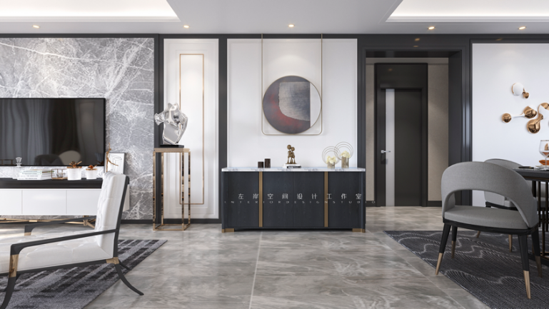 张金亮室内设计过道储物柜采用黑色木质材料与大理石台面组合而成,台面上也摆设着北欧风格的摆设品,墙上的壁画很有特点,抽象艺术风格。