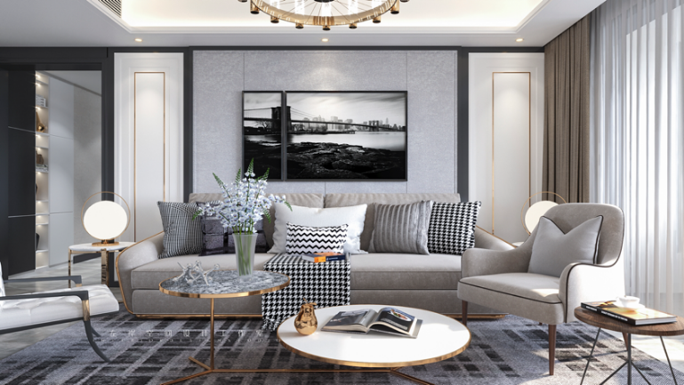 客厅整体设计是北欧风格,质感灰为主体色系,灰色的纹路大理石电视背景墙,黑灰格子地毯,灰色布艺沙发,与金属大理石台面茶几,几种家具都充分发挥北欧风情的独特魅力。电视柜上的几件摆设品,充满金属感和设计感,沙发背景墙上的欧洲风景画,美观大气。
