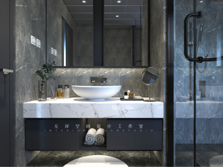 卫生间采用纹路大理石铺面,色调也以黑灰色为主,黑白色大理石台面拼接而成,简越又时尚。