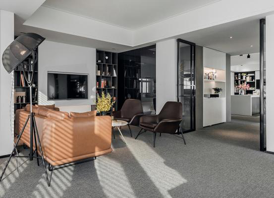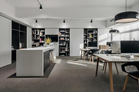 宋必胜设计本案打破常规办公空间设计,开放流畅的办公环境赋予空间更多的可能性,让人与人的互动变的密切。围绕着展示工作台,至此工位不再是办公室的核心,让工作间的交流更自然舒适。水吧区除了阅读、品茗还适合两三人的讨论,三五人的叙旧。独立办公接待区的设置,增加了私密性,客户朋友间的约谈叙旧变得亲密而从容,如果不想被打扰,则可以一头埋进工作之中……