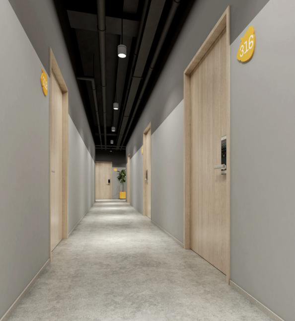 灰色调的走廊,点缀原木的门,缓和了黑与灰的冷冽感,再加上明黄色和绿植,为整个空间增添了一层活力和动感。