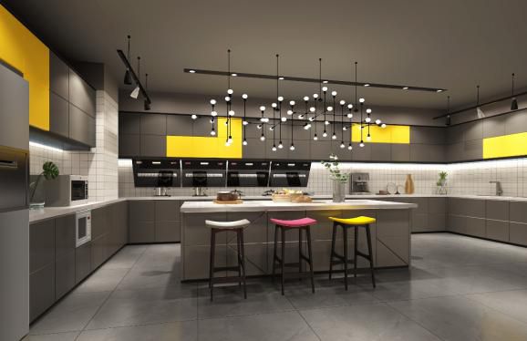 开放式的厨房,采用都市灰调。糖果色的柜子和吧椅点缀其间,配以工业风灯具,更让这个空间充满了想象力,丰富了空间的层次。