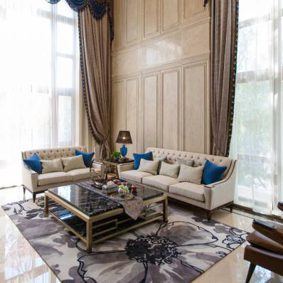 蓝色的抱枕提高空间亮度,与白色沙发产生视觉上的色彩碰撞,自然垂下的褐色窗帘在两边悬挂,茶几的深色与地毯想呼应,开阔的空间,大气的舒适感,邹咏避开传统客厅的设计风格,在现代感上,设计师描绘出的元素美感,采用特色的装饰元素,营造出独特的空间。