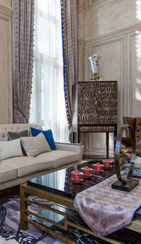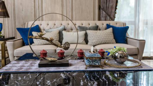 茶几,饰品,在空间中营造出一种浑然一体的雅致美感,用特色的蓝色抽纸盒,深色金属鸟儿,与周围环境彼此呼应,延续了整体空间的艺术氛围。