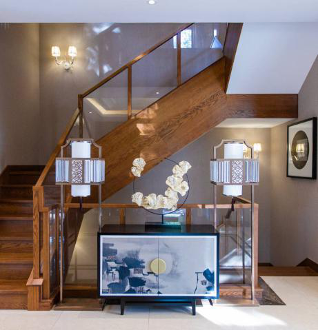 色白花清,以一幅山水画占据视觉的中央,在墨色渲染里感受这设计的艺术美感,楼梯间的小灯设计照亮空间角落,使得空间内光线散布均匀,两边对称装饰品尽显出生活品质,金属镂空设计搭配白色灯饰,在金属圆的两侧相辉映。邹咏设计整体的弧线搭配圆弧,流畅均匀,富有动感。