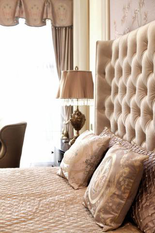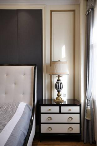 这里采用布艺装饰,凹凸有致的背景给人舒适感,在手边的台灯,夜晚是否曾点亮,捧一本书,在床边桌上放一杯茶,品茶之余也可以进行阅读。邹咏追求的雅致在温馨中逐渐升华释放。