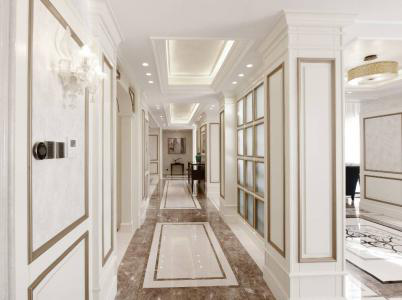 延续着前面的设计基本色调,用轻奢感的金搭配着素净白,在这一方净土中,处处皆是美景,宽敞走廊的通透感更加强烈,有距离感的线条间距,有节制的奢华感,营造出一种丝毫不显浮夸,不喧嚣的空间。