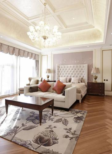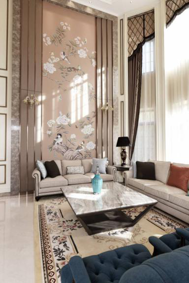 空间布局尽量做到通透感,在视线上做到所及之处,无遮挡,在上下间距较为宽广的空间里,这样的设计更能让人眼前一亮,感受到宏伟的大气和领袖该有的磅礴气质,在墙壁上采用鸟和花作为点缀,素净落地窗帘给与室内最大的光线,角落的设计别有用心,黑色弥补色彩上的不足,使整体色调调和。深蓝沙发的质感触手可得。
