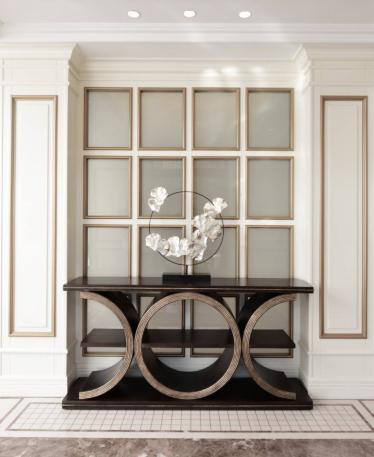 弧线和钜形直线最佳的融合,金色边框尽显尊贵奢华感,深色柜子搭配的背景产生视觉效果,弧线半圆切割而成,切面的细小纹理富有质感,层次分明。邹咏设计装饰品倚落在简洁圆上,白色装饰品的简约感令人赏心悦目。