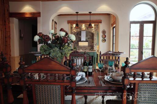 给上层空间留出足够多的位置,餐厅的灯饰较为简洁,让空间沉淀时间的暖意,整体色调的偏向深色,在餐桌上布置的花束也是一点装饰,墙体上弧线透空,让户外光线更多的投射进来。