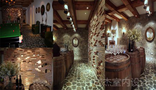墙壁的多种镂空是别具心裁的设计风格,酒桶融于设计之中,度假式的风格给人轻松的体验,酒窖的设计采用露木结构,体现出空间的厚重感,和历史沉淀感。
