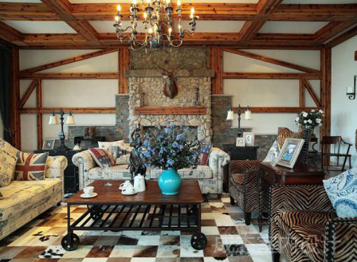 卡维亚庄园客厅的设计饱含温馨感,具有着田园休闲度假的风格,横梁的深褐色给人一种,墙体的设计更为丰富,在以鹿角为标志物的同时,采用深色系更好的搭配着整体环境,线条的构造,以及整体感冲击,都是设计把握住的恰到好处。