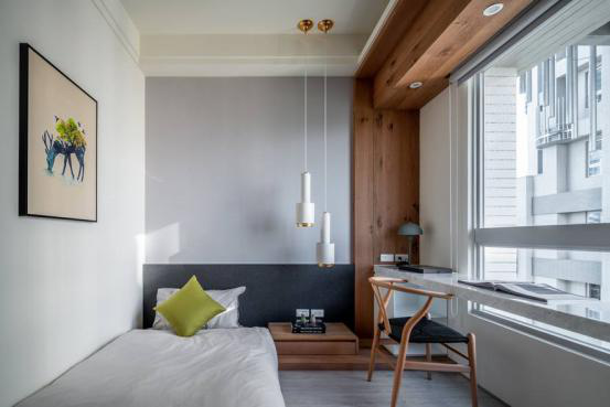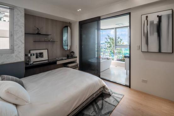主次卧房运用同质调渐进为明亮色域,主卧房以轻透玻璃中介卧床区与泡汤区,使空间若有似无中形成三界分野;主人能于绿意绕屋中独享沐浴净身之乐,也能于睡卧时畅意开放拉门,取自然风光铺盖暖身。相较下,次卧房显现沉静内敛氛围,沿着床头壁面、地板及至床榻,一处一阶打亮空间;辅以斑马帘透入舒心光线,蓄积为静雅心灵的所在。