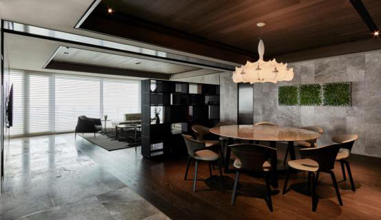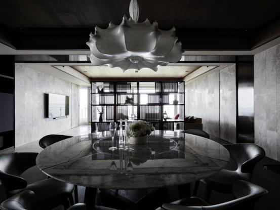 沿着动线环行而过屏风,用餐区域的木质天地开出凝白之花——垂落的造型吊灯对应圆润绽开的洁白餐桌,有如云彩驻足于止水,而当目光落下,墙身的植栽挂饰便趁隙而出,彷彿将远山微观成几点青葱绿意,传达出舒心眺望的放松视野。此外,设计师特地保留餐区主墙的拼接线纹,既呼应两侧垂直构成的黑镜隔间与镂空置物架,承揽光线浸透并反照于用餐区域,亦对比地坪的水平线条,和谐地表现场所的内在关系,使人透过咀嚼慢咽的过程,重获一份祥和宁静的无争之心。