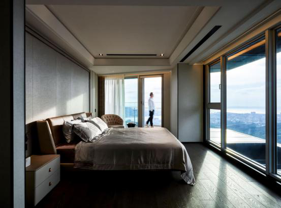 卧室同样利用量体的制高优势,依循屋舍体裁开擘出两面落地窗,导引进绝大的光影奔流,冲刷出木质地坪与机能天幕的简约质感,同时拉伸长型空间的宽敞视野,使私领域亦饱含明亮层次。卧床则呼应地板采用红棕色系呈现,床板选用皮革包覆,与周边单品一同强化场域的核心存在,并在壁布、单椅等温润物件的围绕下,完备梦寐之间渴求的安静时光。