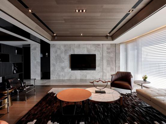 以ㄇ字型的灰色镜带为弱分界,甫踏上起居区块随即感受到丰沛日光,揭示了广阔山河是为量体核心,使观者立于屋内便能拥抱山形水影,再搭配宽敞的户外露台,紧扣生活与环境的互动关系。除却向外推展,袁世贤设计亦援引自然元素入内,于简约的量体线条中,运用温煦木质与洁净石材,铺垫出毫不喧嚣的空间底蕴;并藉由艺术地毯界定出明确区块,其中软件的主要色调应和立面色系,佐以亮橘与暖棕色彩增添场域温度,为温馨柔和的家居感受升温,亦彰显宅邸稳定心房的独特魅力。