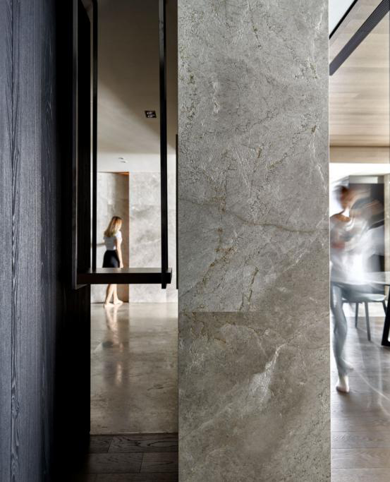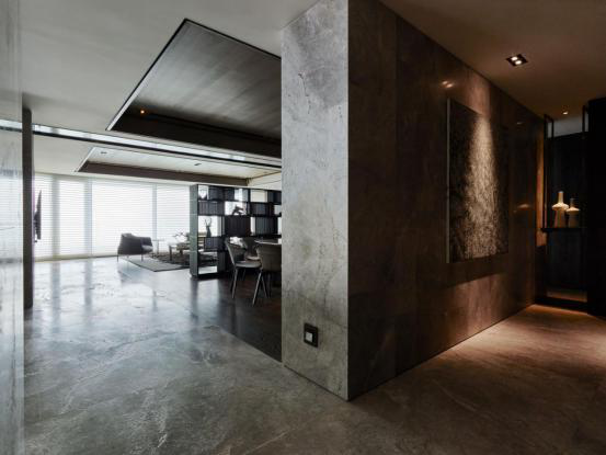 走进玄关,矗立的云纹石屏搭佐重点式照明,首开家居沉静而神秘的黑纱,使双眼不禁凝视起当央挂置的巨幅画作——画面中一片狂风乱舞的芦苇花群,撷取量体临岸所见的自然意象,将当地真实的日常风景截角收藏,无形中叠合「内」与「外」的休憩想象。而开放式规划的落尘区域,与客厅采用相同石材作为基底,悄悄破除区块隔阂,进而达致延展空间的视觉效果,并在鲜明采光中形塑出醒目的廊道动线,引人进入下一个叙事境界。