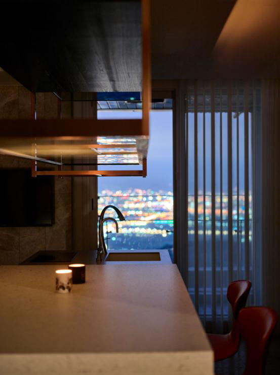移步回到用餐区旁的轻吧台区,此处承接餐区的纯白元素,转化为简洁中岛与镂空层架共构的轻盈视感,铁件与石质相互晶莹映照,使场域瞬间轻快起来;搭载造型趣味的鱼尾高脚椅,其暖手的橘红色系,一如客厅采用的色彩计划,在细微的比例调配下,更加回应了在此吃食谈天的即兴需求,作为便于近察家人动态,及远观都市灯火的最佳景点。