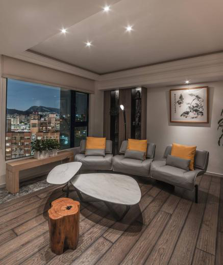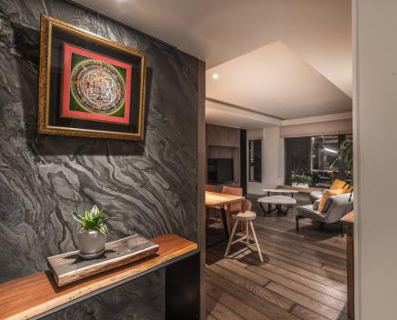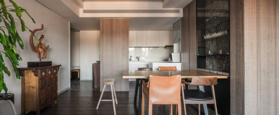 本案的业主夫妇从原本九十多坪的住宅,搬至现在五十坪的宅邸;喜于收藏艺术品及爱好东方元素的两人,希望能将这样的元素带入生活场域中;因此如何有效地规划空间及选配材料,让每件收藏品得以在最适切的位置,对设计师而言是一大挑战。廖月凰建筑及室内设计首先在地面及柜体的选材上,以大量木皮围塑东方氛围;搭佐天然石材增添自然质感,减缓单一色调的视觉印象;两种质材相互交错,延伸至大面落地窗,消除空间中的界线;当室外的光线与清风引入——无界.东风的意象,应运而生。