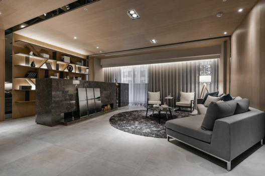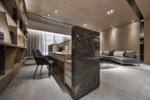 绕过石墙,才发现后方竟别有洞天;浅色木纹于石材框塑而成的范畴中舒缓有致地铺展开来,与后方的展示书柜及内部供休息的小型卧榻,共同建置起一方适宜读书、洽公甚至小憩片刻的安稳场域。考量转角处的过道动线稍窄,魏立彦竹村设计将桌面及柜体内缩一吋余,并为容易划伤人的边缘做出钝角;每一分设计,皆在在地体现了竹村空间体贴且细腻的一面。