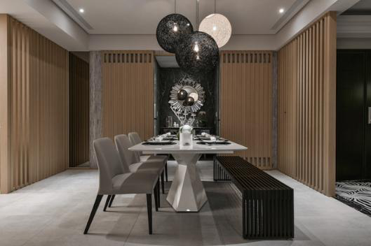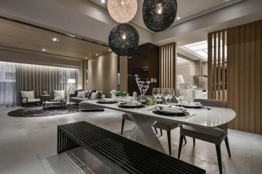 由客厅移步至餐厅的过程中,横流的梁体成为明暗之间的过渡象征;此区由松散而不失秩序的格栅取代实体墙面,当实体光影在孔隙间不停穿梭游走,散落一地的影迹旋即为此区域填满虚实交映的朦胧感受;表虚里实,化阴为阳,重重叠叠地替简洁餐食处妆点出变幻莫测的多重样貌。洁白方形餐桌以带弧度的轻薄型态创造可见的清爽感,漏斗状桌脚则从切割造型释出别样现代风情。松软单椅偕上长型椅凳,在造型、颜色上与场景融为一体,随空间氛围拥有一致的呼吸韵律。