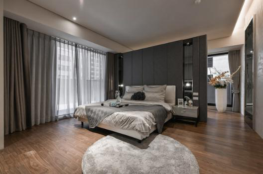 公领域的人文雅香伴随着木纹递入主卧,受光线浸润后为单纯的睡卧烘托出宁静而悠远的想象;由于卧室为双面采光,设计师将床头主墙向前挪移,让出一处可更衣的空间,不仅解决了风水问题且收整合视觉之效,亦为更衣室引进更明朗的感受。