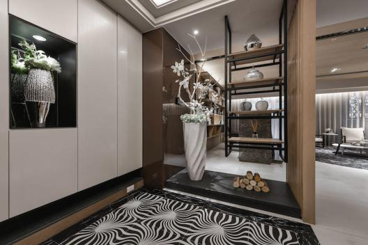 进入玄关,齐整的大面柜体中留下一处壁龛,以便屋主随四时更换收藏品,而大尺度亦保证了足够的展示机能。由铁件及层板构建的简约置物柜,替空间沉入古朴质韵,亦为原先可穿透的视野留下一层念想。带点魔幻曲线的花纹地砖划出一块鲜明的落尘区,有效翻转木作予人的保守印象,而流动的纹理宛如一股轻柔的簇拥力道,以一双无形的手将我们推向屋内。