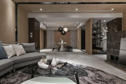 踏入客厅,非传统制式的沙发以宽阔的臂膀迎接归人,使人忍不住投身至此温润的灰质空间,享受片刻无扰攘的宁静。上方光源星罗棋布,开关之间辗转拉出景深的错综变化;带状黑镜则将此细密质韵收束整合,托出厅堂随时光流变的细腻情感。中央的半身高电视墙解决了长型空间中较缺乏的宽敞感,亦为后方书房留下一隅探头的意趣;阵列前行的石墙亦由可大可小的尺度中生出别样趣味,令人不禁趋前窥探内部到底收藏了什么样的景致。