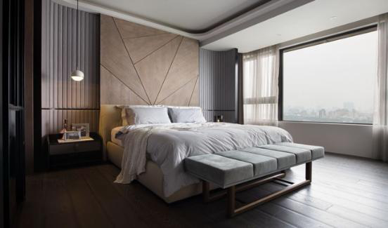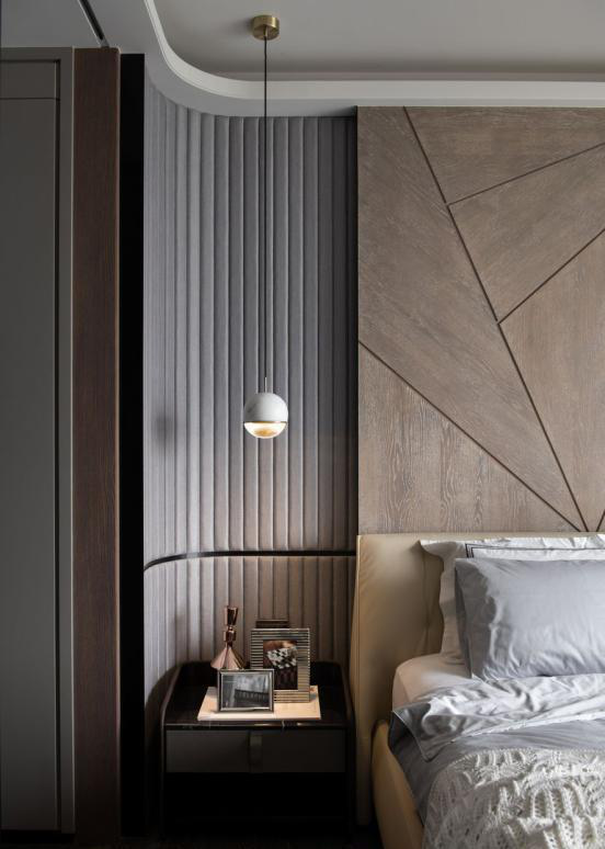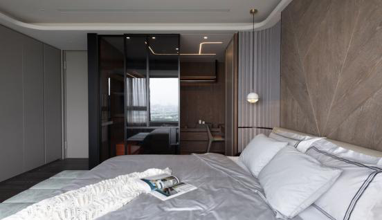接着进入主卧房,不规则拼贴的木皮主墙,是设计师特意微创柔软视觉的冲突手法,然而和谐的色泽选配仍使其不流于突兀。至于量体一贯的弧线精神运用于此,则成为衬托绷布、烤漆与灯饰的巧妙墙景,有意无意间形塑出别致的转折效果。而在空间上,以私领域要件——床铺为心,两翼朝向宽阔窗景及通透设计的更衣间,绵延为一股开放态势,疏开堵塞胸臆的沉闷。更衣间的木质语汇也共同诉说这则安定心神的叙事,并于稳重之中透过天幕的纤细光带,灵巧地撒落光粉,为每日必备的着装时刻敷上尊贵光彩。