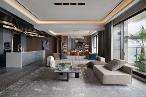 穿越区块地坪的拼接边界,宛如转瞬进入域外之境,公领域天地转而采用更为轻浅的雪白与清褐色,连同软件一体选用灰褐色系,营造差异化的环境感受之余,亦引导人心自动荡世界中逸除,敞开心胸迎接壮阔窗景的怀抱。虞国纶酒店设计转化无垠天空的形神,室内规划具有高低层次的天花板样式,简洁线条展现屋舍的硬朗大度;而转折处的弧角处理,则崭露空间性格中的柔软情意,搭佐环行周边的间接灯源及镜体边饰,更有如云隙透光,牵引眼目与自然相通。此外为依循区域规划并隐匿屋梁下差,设计师明晰地划出两大要处——起居区块和用餐区域,且将暖溶溶的日影意象融入区域肌理,形构与风光同在的生活步调。