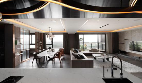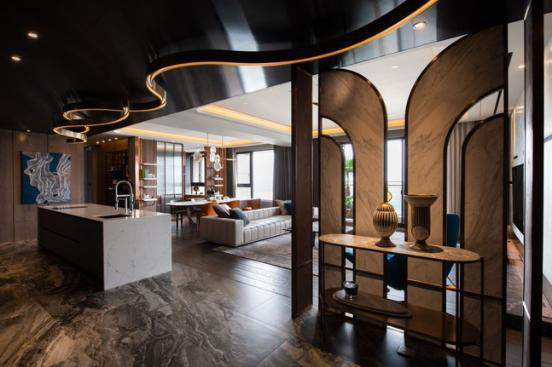 作品《鎏金水岸》的整体光线营造如同探幽,但这寻访路径未留半分窄仄,开放式玄关与餐区中岛同享一地,无隔间设计畅快迎入疏朗日光,为此处幽黑的基质增添光采。而上下采用镜黑材质为天、泼墨纹石质为地,头顶涌现的光潮,则取意屋主衣锦还乡的经历,并融入鱼形及水波样式,暗藏家产丰润、如鱼得水的祝福寓意。其间夹叙于天地中的人情故事,体现在工艺等级的精致屏风,主要选用天然石后制出仿古纹理,搭配镀钛收边,其所形塑的涌泉形象,隐喻携手呵护三代生命使家运昌隆,而吉祥寓意更化解了阳宅穿堂的风水禁忌,展现从容如水的性格本源。